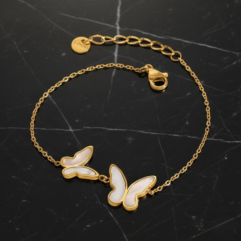 Ce bracelet est un bijou féminin qui met en avant un pendentif papillon, symbole de légèreté et de transformation. Sa chaîne dorée fine et ajustable est rehaussée par deux papillons blancs incrustés, offrant un rendu soigné et harmonieux. Conçu en acier inoxydable, ce modèle est résistant à l’usure et garde son éclat malgré un port fréquent. Sa finition dorée apporte une touche intemporelle qui permet de l’associer facilement avec d’autres bijoux ou de le porter seul pour mettre en valeur le poignet. Sa structure légère et son fermoir pratique en font un accessoire confortable et simple à utiliser au quotidien.