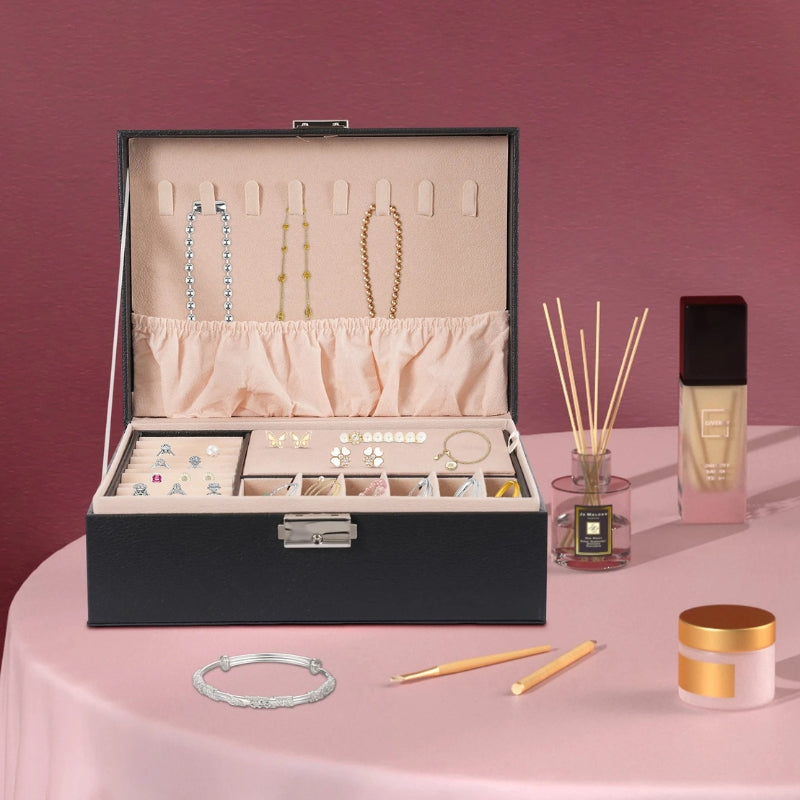 Cette boîte à bijoux en cuir est conçue pour offrir un rangement structuré et esthétique à votre collection. Avec son revêtement noir élégant et son intérieur clair bien compartimenté, elle convient parfaitement à un usage quotidien.