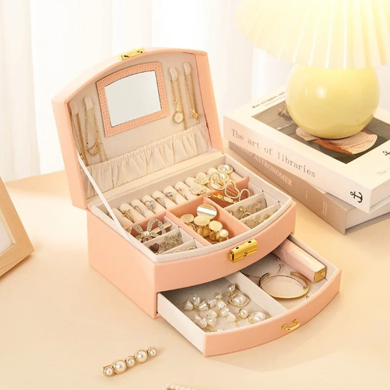 L’intérieur comprend un espace dédié aux bagues, des compartiments modulables, des crochets pour colliers, ainsi qu’un tiroir en bas pour les pièces plus volumineuses. Le design structuré permet de garder chaque bijou bien à sa place, sans enchevêtrement ni perte de temps.