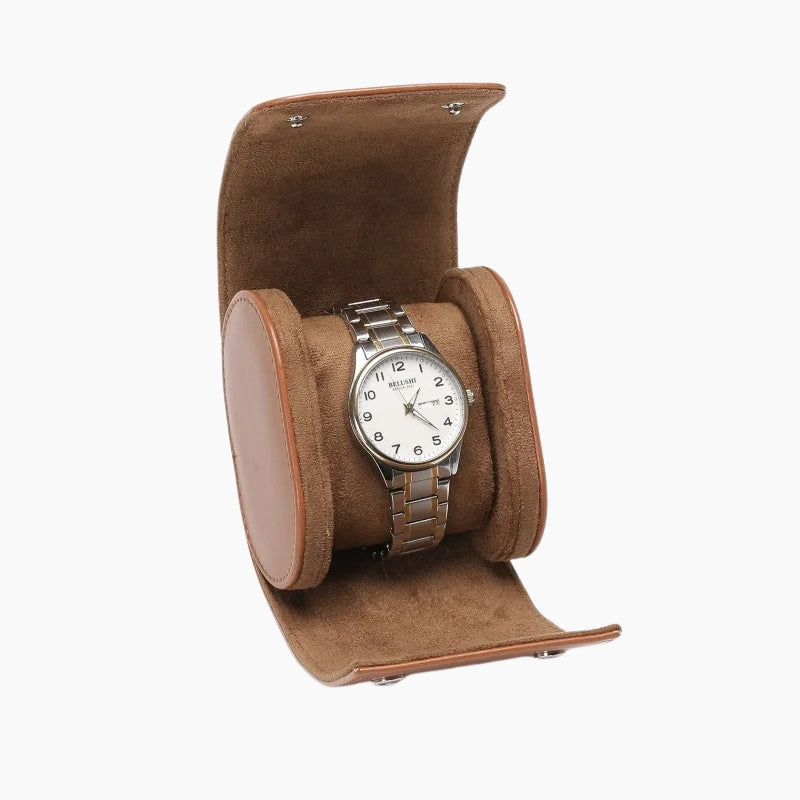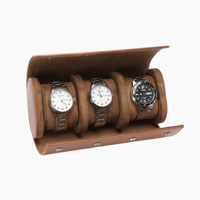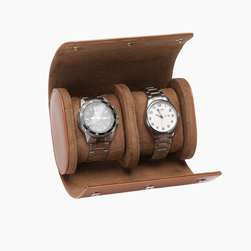 Chaque montre est maintenue par un coussin rembourré dans un compartiment séparé, assurant stabilité et sécurité. L’étui se ferme facilement à l’aide d’un rabat souple qui reste bien en place une fois replié. Le design compact et la finition marron apportent une touche soignée et discrète.