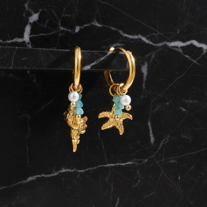 Ces boucles d’oreilles sont composées d’un anneau doré orné de pendentifs amovibles. Chaque paire associe une étoile de mer, une perle nacrée et une pierre colorée taillée, pour une composition harmonieuse et originale. Leur design modulable permet de varier le style selon l’occasion ou l’envie.