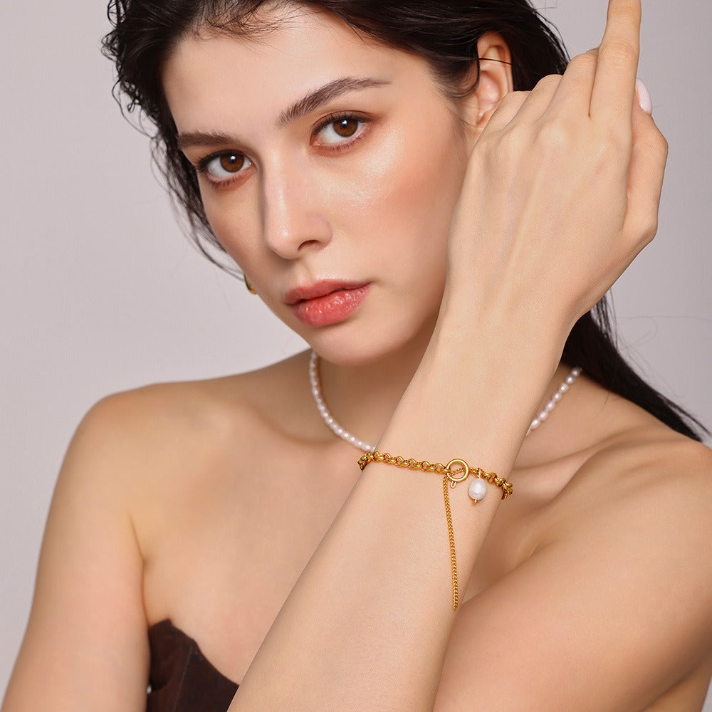 Ce bracelet associe une chaîne fine en acier inoxydable doré à un pendentif en perle irrégulière. Son design minimal et sa taille ajustable permettent de l’adapter facilement à tous les poignets. Il peut se porter seul ou accompagné d’autres bracelets, et s’intègre aussi bien à un usage quotidien qu’à une tenue plus habillée.